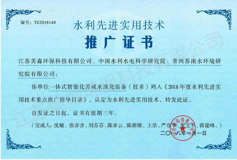 多項(xiàng)技術(shù)獲得了國(guó)家火炬計(jì)劃、江蘇省科技進(jìn)步獎(jiǎng)、水利部先進(jìn)推廣成果;成為美國(guó)水質(zhì)協(xié)會(huì)(WQA)會(huì)員企業(yè)成員,江蘇省循環(huán)經(jīng)濟(jì)協(xié)會(huì)副會(huì)長(zhǎng)單位(水專業(yè)委員會(huì)主任單位);